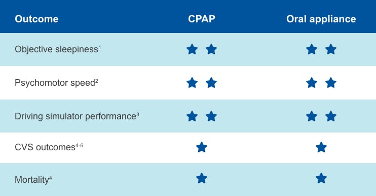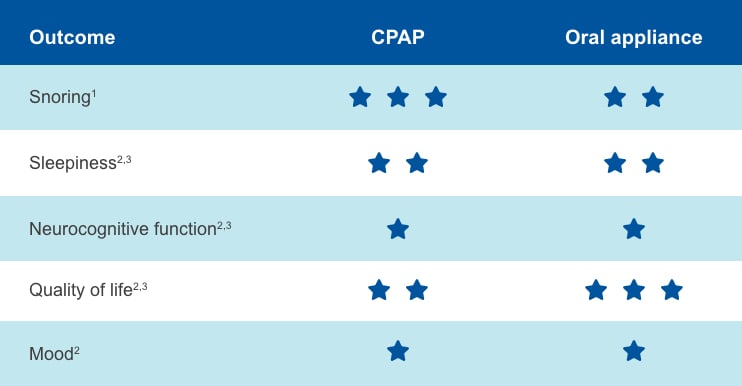 Kada se razmatraju objektivni (tj. mjerljivi) ishodi, individualnih oralni uređaji i CPAP imaju slične rezultate.