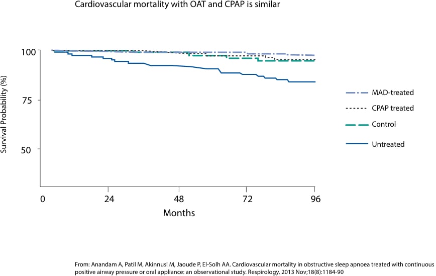 - U studiji iz 2013. koja je pratila 667 pacijenata tijekom 96 mjeseci (ili 6,5 godina), Anandam i kolege nisu pronašli razliku u smrtnosti od kardiovaskularnih bolesti između pacijenata koji su koristili CPAP i onih koji su koristilioralne uređaje.