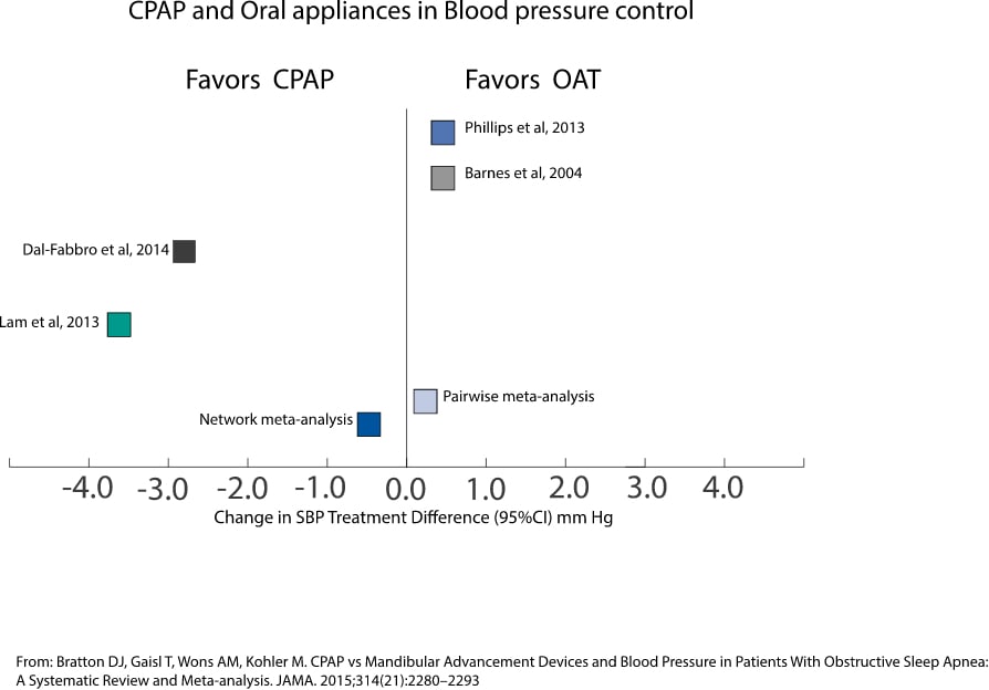 - Mrežna metaanaliza objavljena od strane Brattona i njegovih kolega 2015. godine nije pokazala razliku između CPAP-a i individualnih oralnih uređaja, u razinama krvnog tlaka.